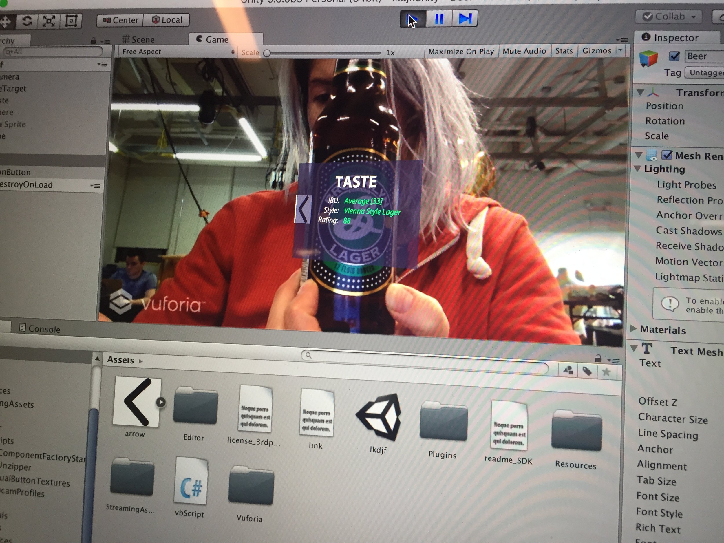Seeing as I wanted to display multiple sets of info, I decided to dive into Vuforia Virtual Buttons, the idea being that obscuring notable parts of the image targets can cue an event. I thought it might be nice to have a “button” on the physical object since you would be holding the beer in your hand, most likely, so then you would just have to move your fingers around on the one hand since the other hand would have the phone. I got this to work pretty well with my hand and had positive feedback when I demo'ed the project for people.